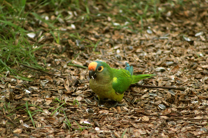 Voa em grandes bandos. Alimenta-se de sementes, frutos como cocos