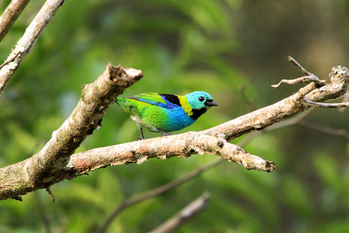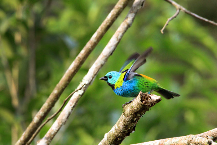 barriga são azuis; flancos e infracaudais verdes. A fêmea