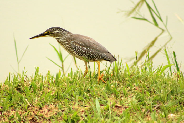 Cinzento com o dorso e as asas estriadas de preto; pernas curtas