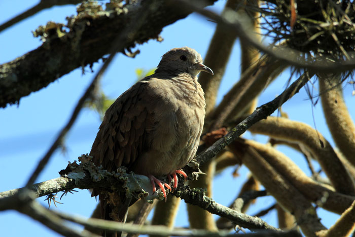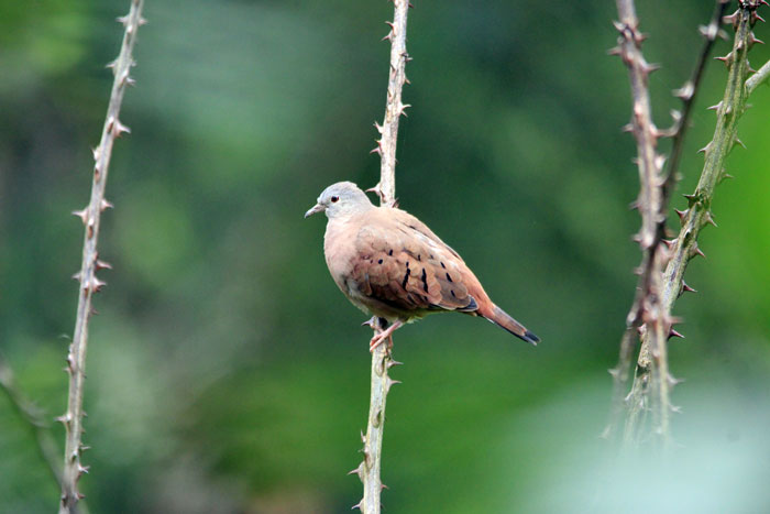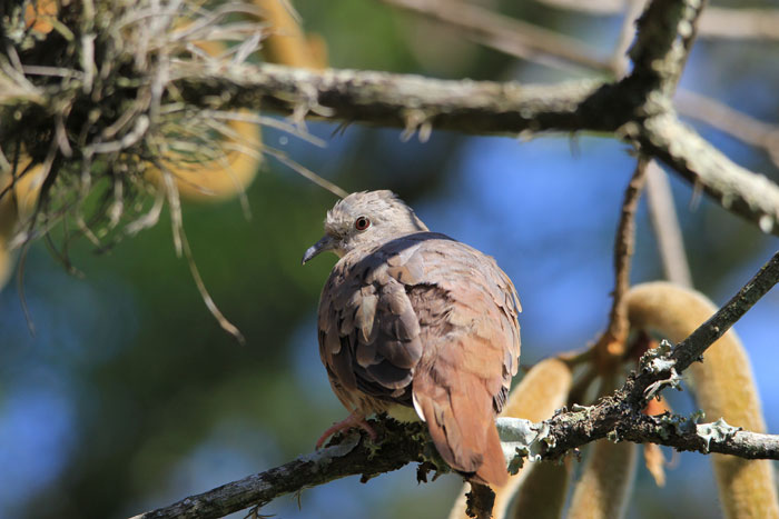 cinza; corpo marrom-avermelhado com as rêmiges marrom escuras;