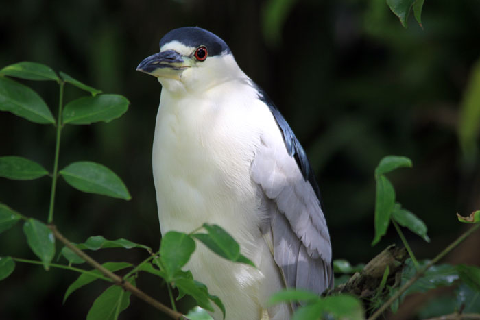 o alto da cabeça, dorso e bico pretos; duas penas brancas,