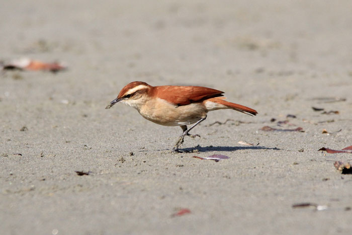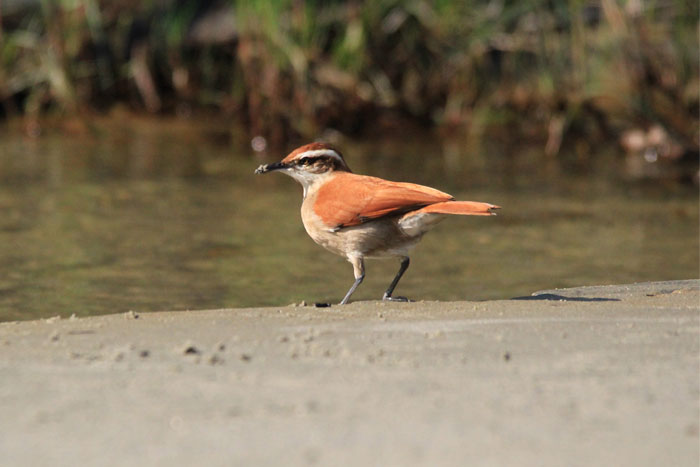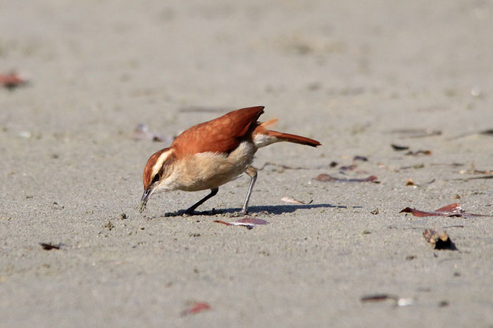 Suas pernas são cinzentas. Ferrugíneo por cima,