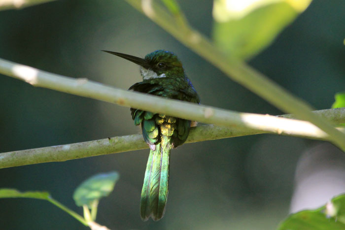 mento branco; as quatro retrizes centrais verdes. Seu bico é