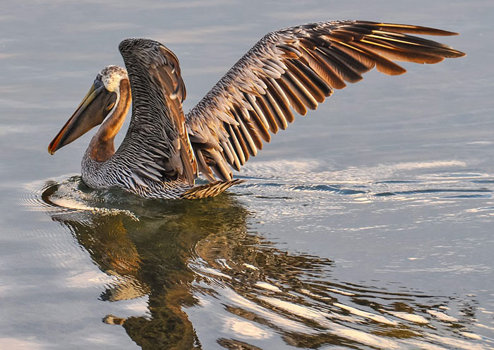 rasas. O pelicano marrom geralmente mergulha sobre os peixes para